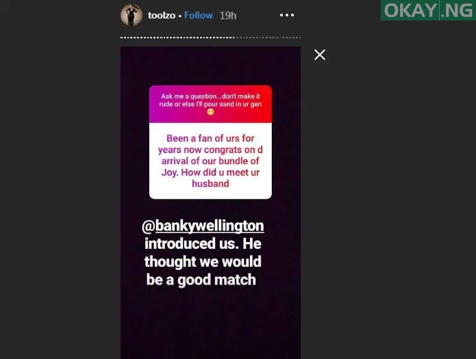 When asked ‘How she met her husband’, Toolz replied that “Banky W introduced us. He thought we would be a good match.”