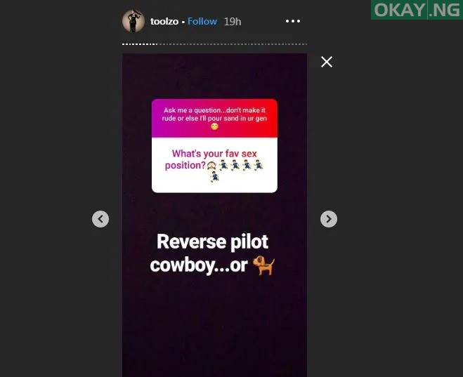 Tolu Oniru, popularly known as Toolz, in a question and answer session on Instagram revealed her favorite s•x position and more.
