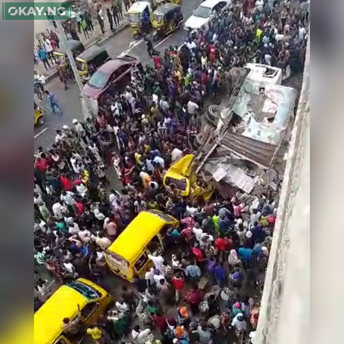 A major tragedy was narrowly avoided on Saturday after a fully loaded truck skidded off the Pen Cinema Bridge in the Agege area of Lagos, crashing into two stationary commercial buses parked beneath the bridge.