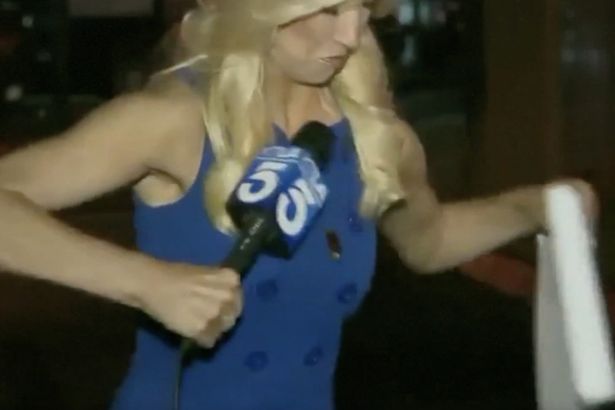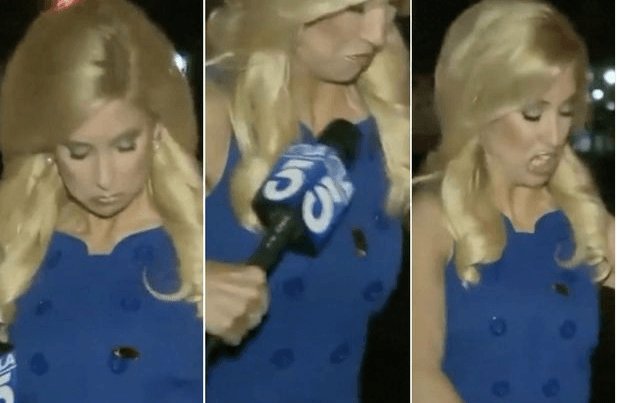 A TV presenter identified as Mary Beth McDade has since gone viral after screaming in terror as a massive cockroach landed on her br*ast during a broadcast.
