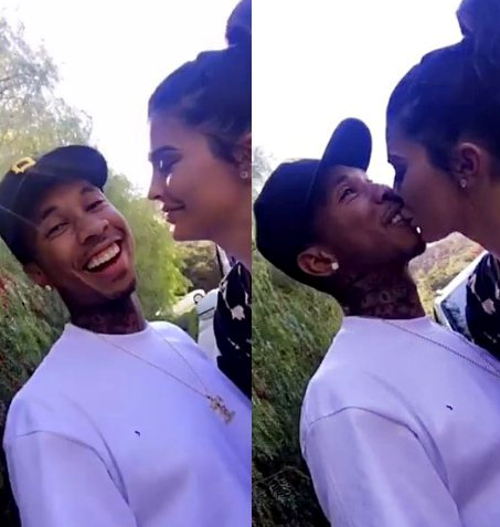 American rapper, Tyga all smiles as Kylie Jenner plant kisses on his lips. Two love birds on the roll. See below;