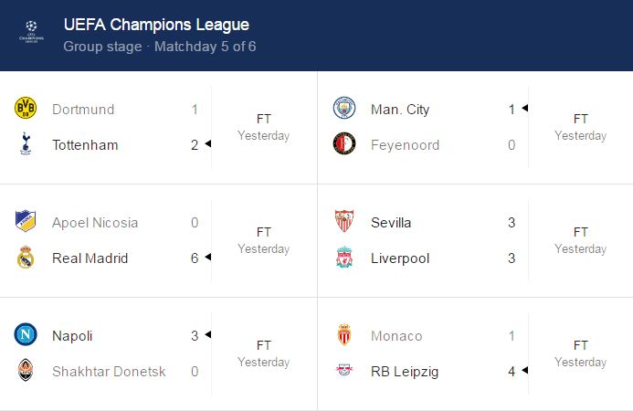 This is the result of all the UEFA Champions league games played in various part of Europe yesterday. Tottenham, Manchester City, Real Madrid, Napoli and RB Leipzig all won their match except Liverpool who drew with Sevilla yesterday.
