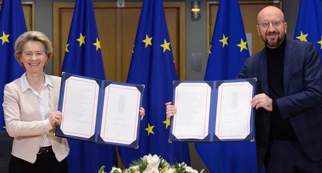 Ursula von der Leyen and Charles Michel, the heads of the European Commission and European Council, smiled at a brief televised ceremony to put their names to the 1,246-page Trade and Cooperation Agreement in Brussels.