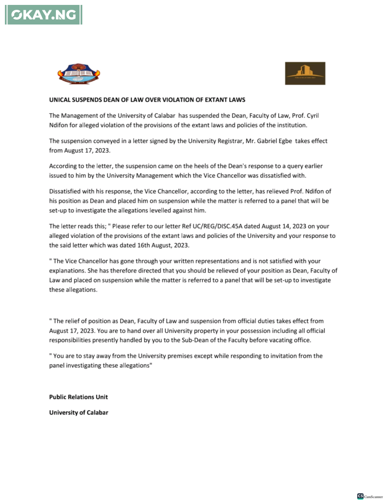 The suspension came after Prof. Ndifon’s response to a query issued by the University Management was deemed unsatisfactory by the Vice Chancellor.