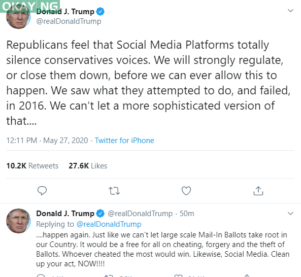 President of the United States, Donald Trump has threatened to shut down or regulate social media platforms, after Twitter Inc. for the first time added a warning to some of his tweets prompting readers to fact check the president’s claims.