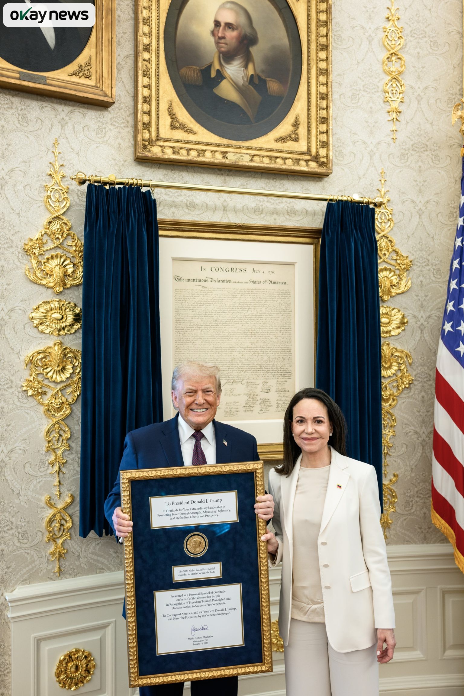 Okay News reports that President Trump expressed his gratitude for the “wonderful gesture of mutual respect” in a statement shared on social media shortly after the meeting. The President praised Machado as a “remarkable and brave voice” and a woman who has endured immense challenges in her struggle for democratic reform.