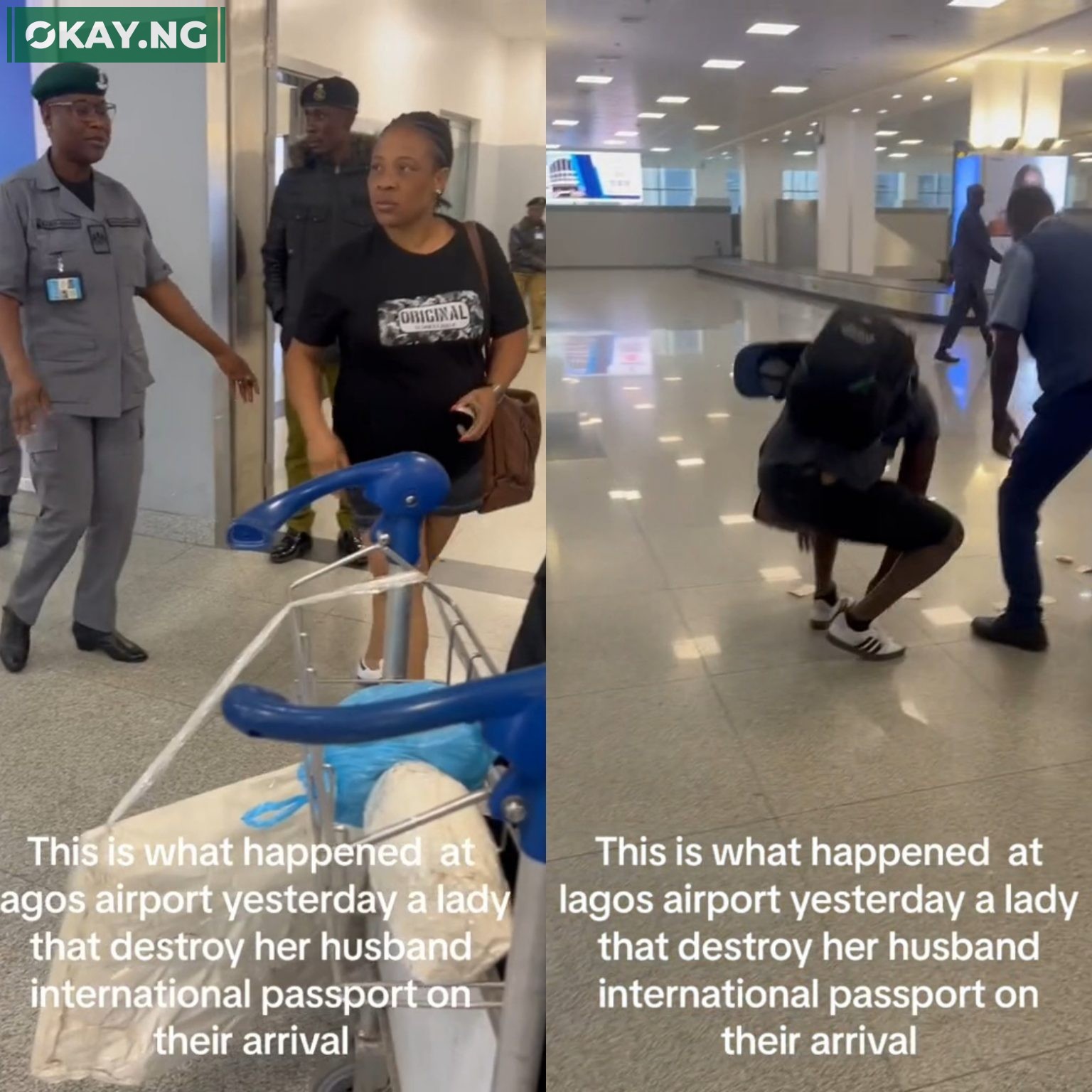 A shocking video that surfaced online has captured the dramatic moment a Nigerian woman destroyed her husband’s international passport during a heated altercation at an airport.