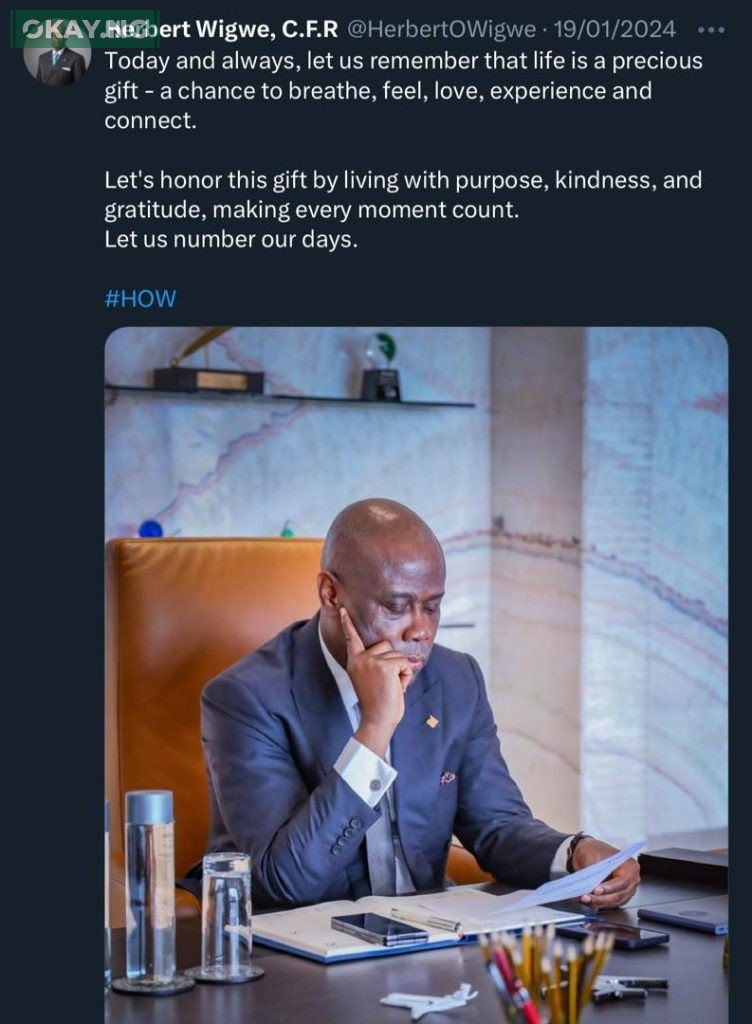 In the message, Wigwe urged his followers to recognize the preciousness of life and to live with purpose and gratitude.