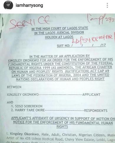 Harrysong shared a copy of the legal document on his Instagram page and captioned:
