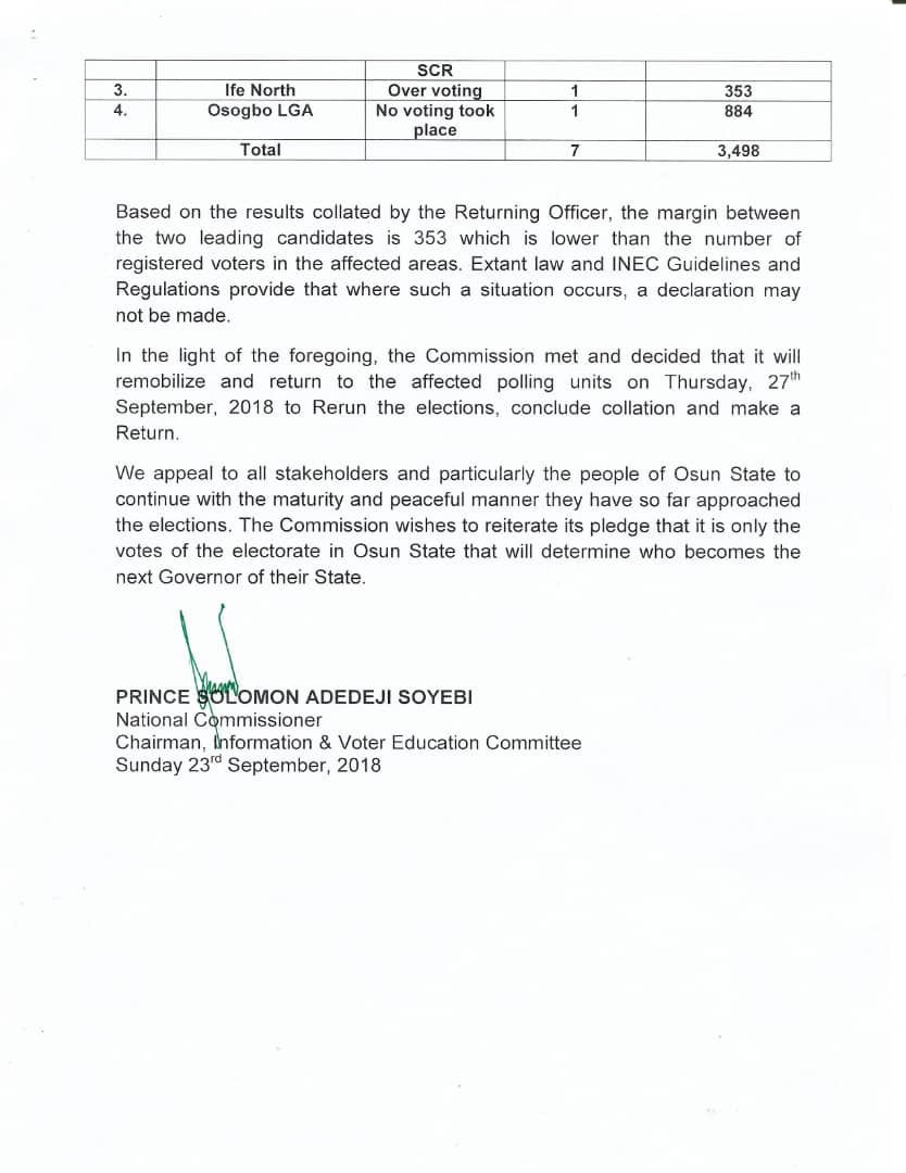 The Independent National Electoral Commission (INEC) on Sunday issued an official statement about the conduct of the Osun State governorship election.