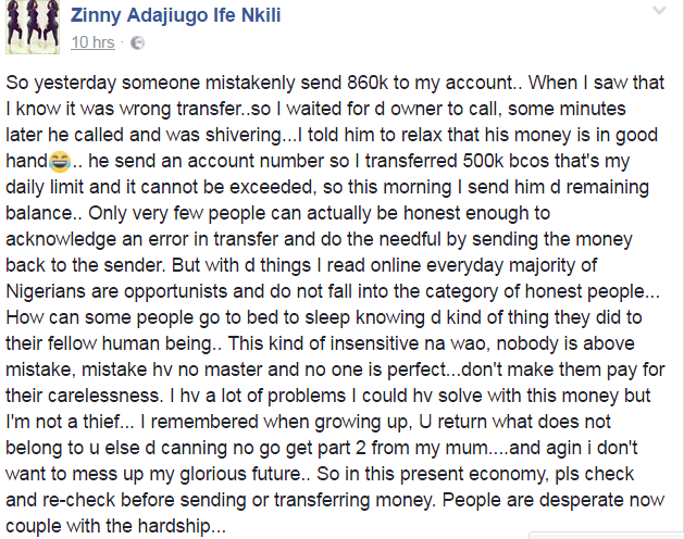Below is a story of a young lady who returned N860,000 that was mistakenly transferred to her account. She’s been identified as Zinny Adajiugo Ife Nkili.