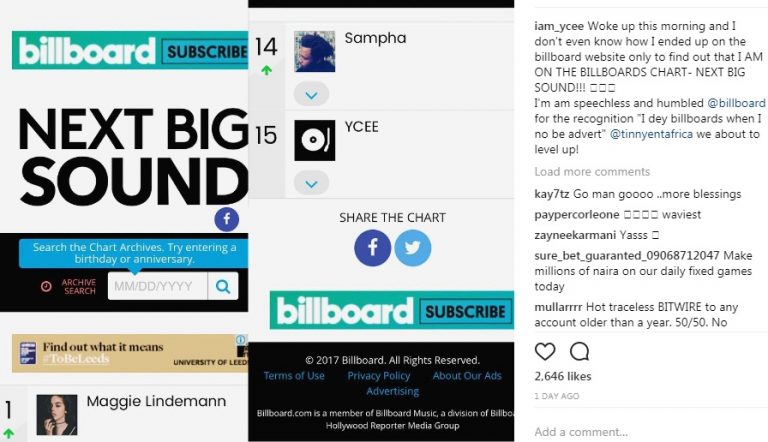 YCee could not contain his excitement as he took to Instagram to express his surprise for the recognition by Billboard.