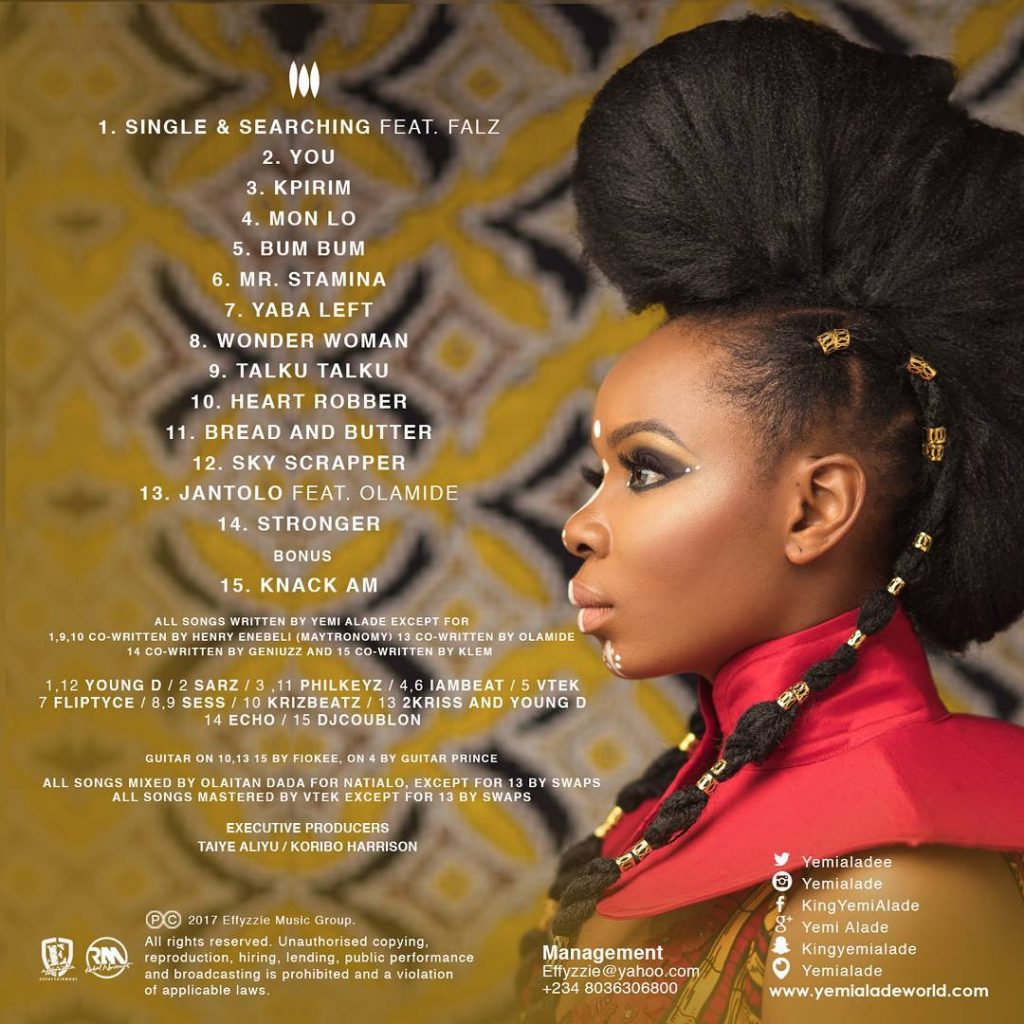 The album includes: ‘Single and Searching’ ft Falz, ‘You’, ‘Kpirim’, ‘Mon Lo’, ‘Bum Bum’, ‘Mr Stamina’, ‘Yaba Left’, ‘Wonder Woman’, ‘Talku Talku’, ‘Heart Robber’, ‘Bread and Butter’, ‘Skyscraper’, ‘Jantolo’ ft Olamide, ‘Stronger’ and bonus track ‘Knack am’.