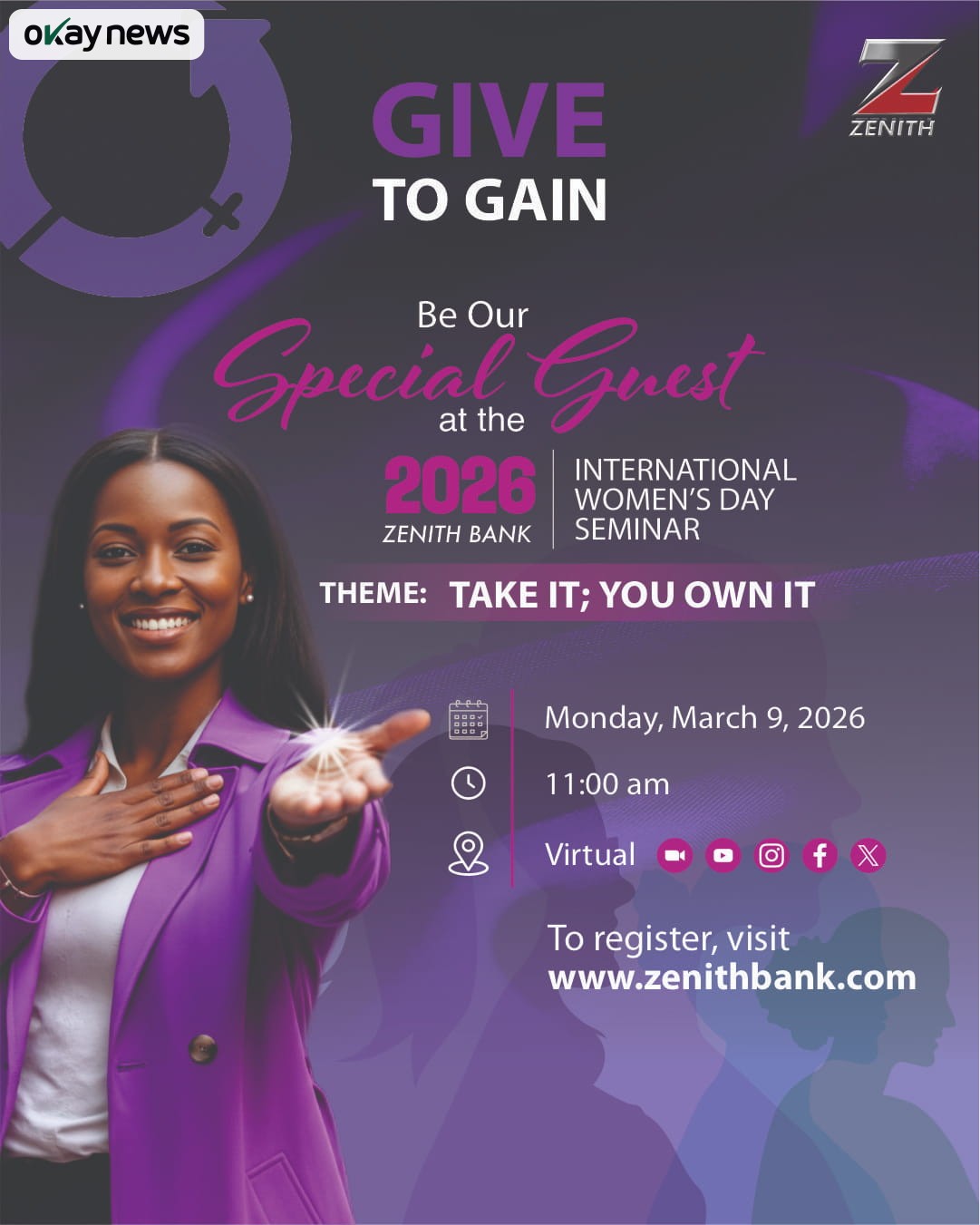 Okay News reports that the seminar aligns with the global International Women’s Day theme “Give to Gain,” which highlights the importance of intentional investment in women as a pathway to sustainable social and economic progress. Reflecting this philosophy, Zenith Bank has adopted the seminar theme “Take It, You Own It.”